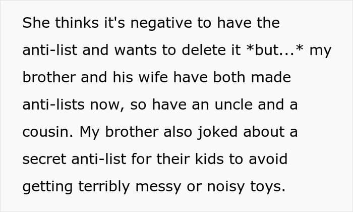 And if that wasn’t enough to ruffle her tinsel, the anti-list trend started spreading. Soon, the brother, his wife, an uncle, and a cousin all joined in, even joking about a secret anti-list for their kids to dodge noisy, messy toys. The family is now split: some see the anti-list as a holiday hero while other view it as a Christmas catastrophe. So, is the anti-list naughty or nice?