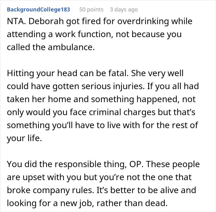 Last week, a young employee shared her story on r/AITAH about an incident during a business trip when she stepped in to help an intoxicated colleague, only to face backlash for her actions.