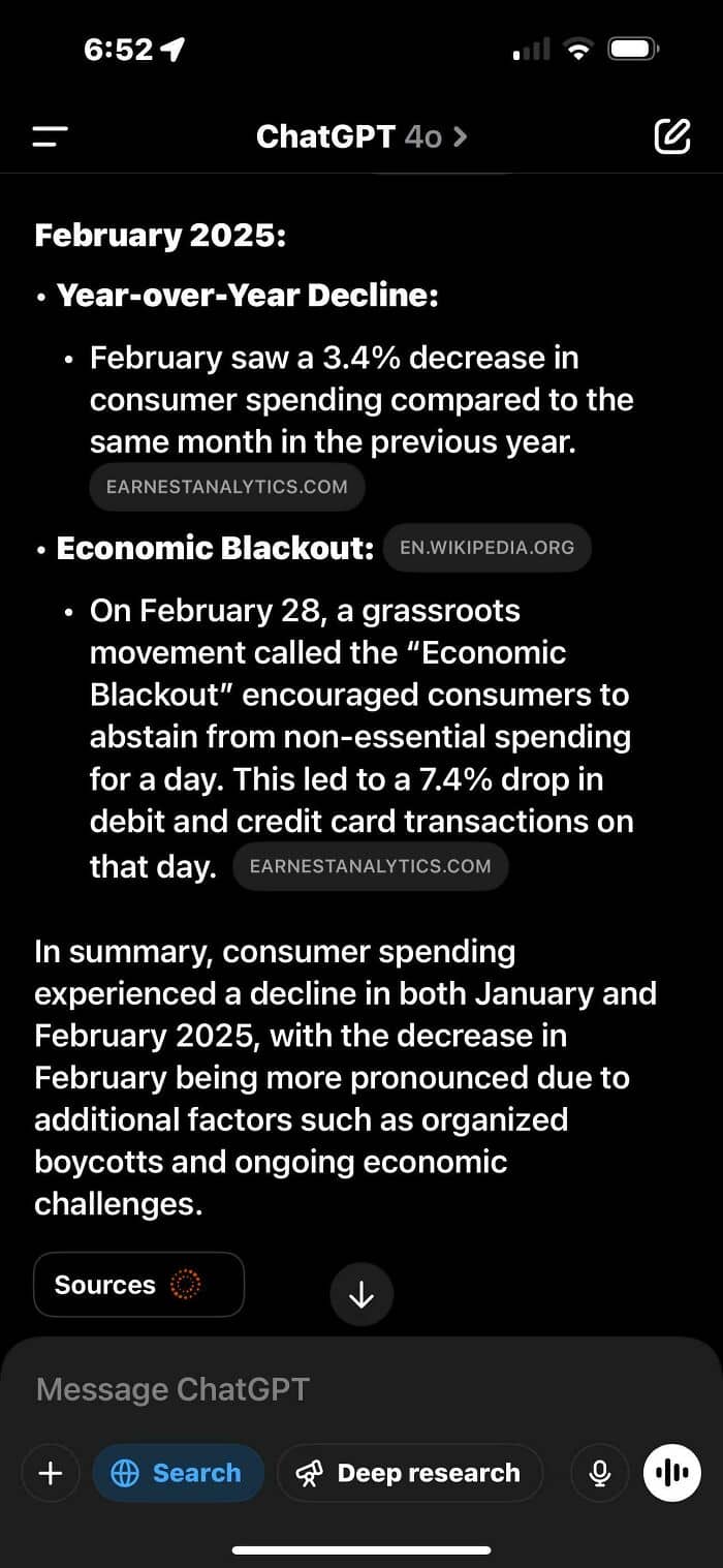 I’m delighted to have been proven wrong about the outcome. I explained the concept of the Economic Blackout to my children, emphasizing its purpose and significance. Although I was initially skeptical about its potential impact, we decided to participate regardless. Seeking clarity on February’s consumer spending, I turned to ChatGPT, preferring it over Google due to its concise and relevant responses and was pleasantly surprised by the results.