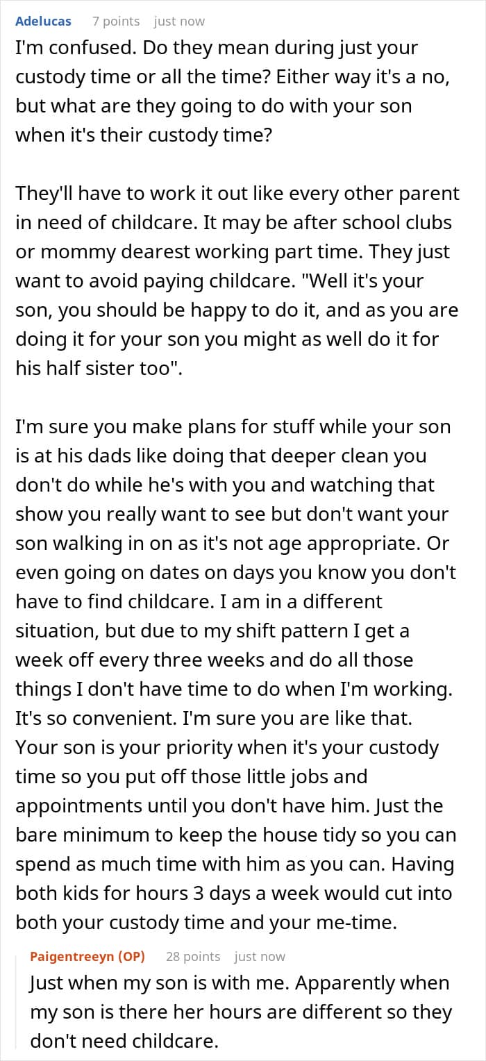 Out of nowhere, her ex asked her to babysit his daughter three days a week. She gave him a firm no (multiple times) and straight-up ignored his barrage of follow-ups. His wife then texted her repeatedly, insisting she “be a better mother” and treat the lovechild like family so the half-siblings could grow up close. OP, however, refused to budge.