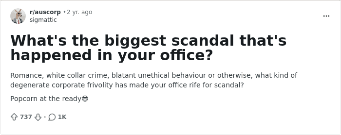 There’s a post on the subreddit r/AusCorp — a place where members of corporate Australia come together to discuss and gossip about their roles and industries — that has everyone sharing the biggest scandals to have shaken their offices.