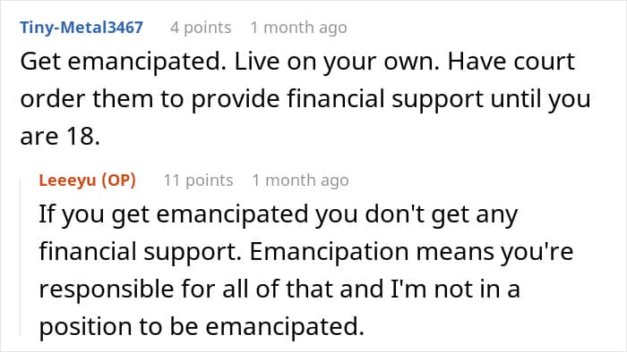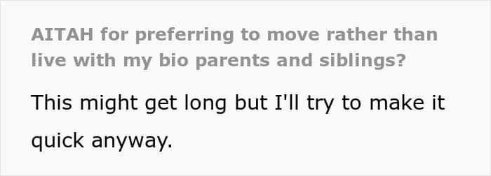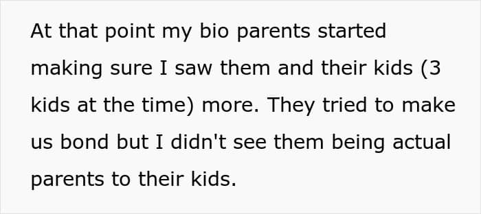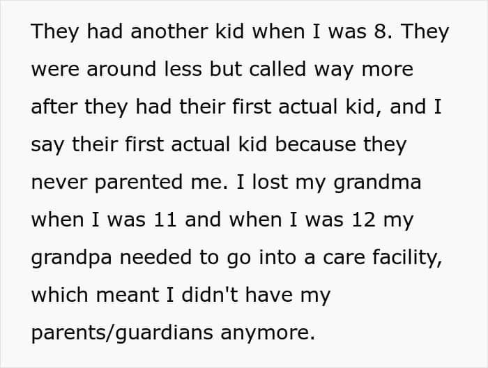 Luckily at the same time, the OP’s uncle offered to take them in, too. After a court interview where the OP chose to live with their uncle, the court respected that decision. At this point, the biological parents suddenly became more present, but not necessarily more responsible. They even began to force bonding between them and their younger siblings, whom the OP described as spoiled and poorly disciplined.