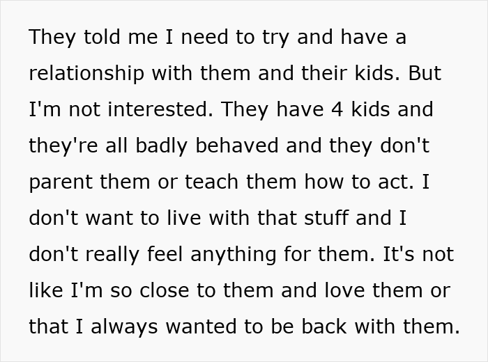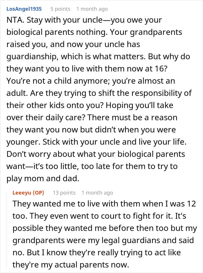 Netizens insisted the situation was already settled in every way that mattered. They also stressed that the biological parents had years to step up and didn’t, encouraging them to live with the uncle without guilt. If you were in the OP’s position, would you move with the uncle or stay behind to try to rebuild the relationship? We would love to know your thoughts!