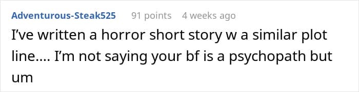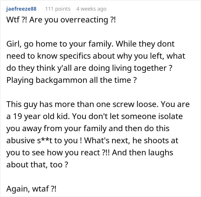 A common “accomplice” of abuse is isolation. The victim doesn’t have a support system or allies to turn to. Indeed, this also means they don’t have someone to tell them just how disturbing their partner’s behavior is. The woman states that she can’t go to her family over this issue, as, sadly, they would focus on her relationship and not the matter at hand. Ultimately, she needs to realize that he won’t stop this sort of behavior since he clearly enjoys it.