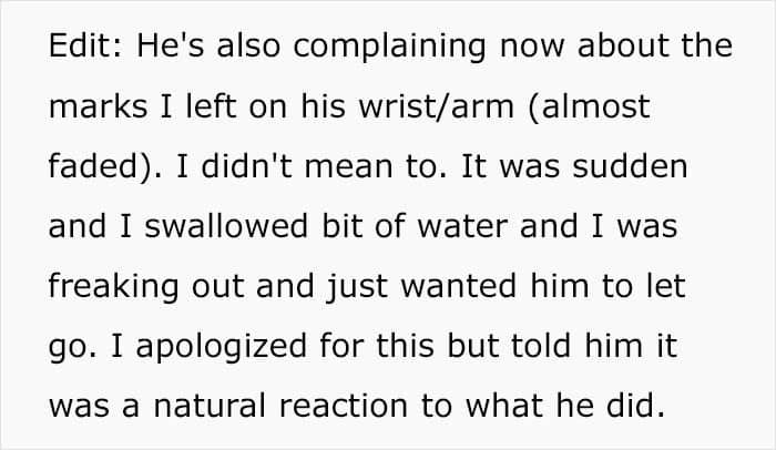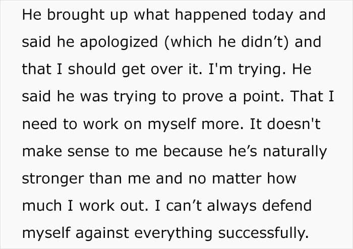 Just the fact that the boyfriend’s actions draws comparisons to actual torture methods should be enough of an indication that he didn’t just overstep a line, he took a running jump. Even worse, he thought it was funny and then had the gall to complain about the marks on his arm. At the same time, he also lies about apologizing.