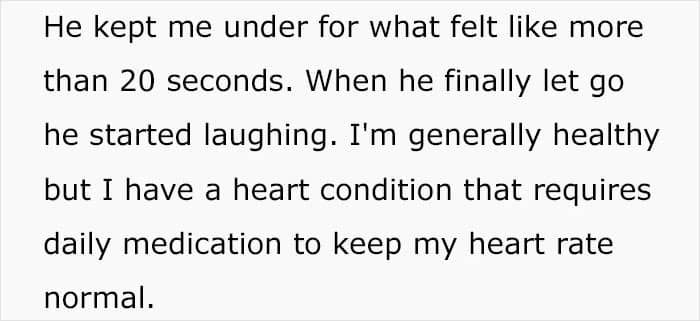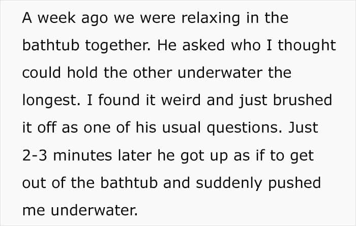Even if he only held her underwater for a second, seeing himself as the victim and then lying about the aftermath is enough to consider a breakup. It does look like this is “normal” behavior for him, as the woman feels like she needs a second opinion. Even though it was not done “in anger” like most “conventional” physical abuse, subjecting your partner to a mock drowning is disturbing behavior. It’s the sort of thing that most folks would run away from immediately.