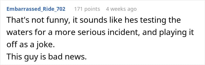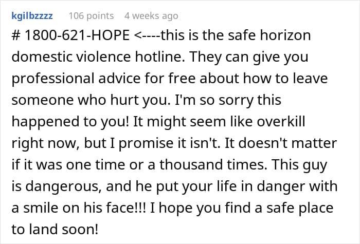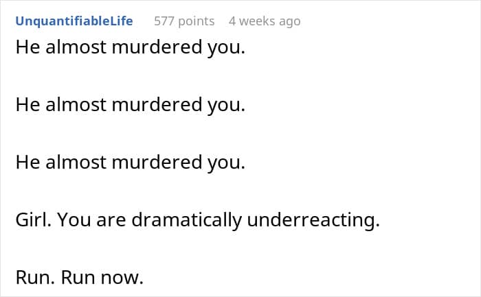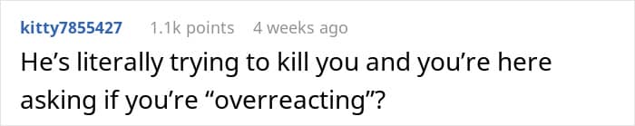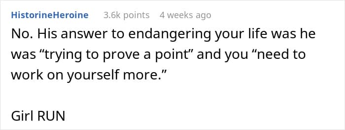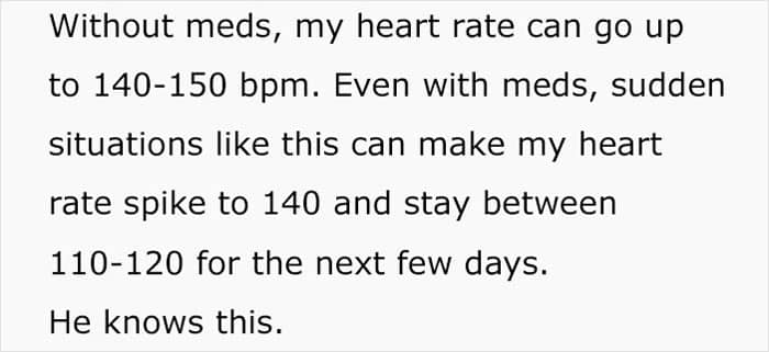 Many of the comments (which can be found below) tell her to leave this man immediately. Even in the best case scenario, he is still a hazard to her health. After all, if we somehow believe that he truly wasn’t acting in malice, he is still willing to make a person with a heart condition believe they are dying. This is a direct risk to her mental and physical health.