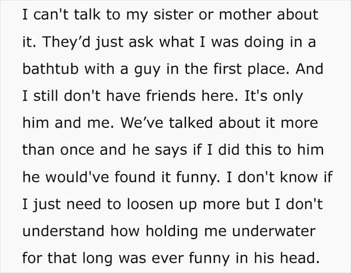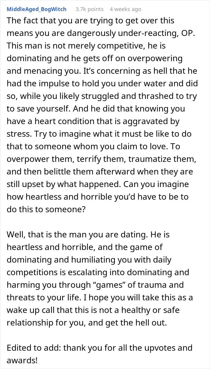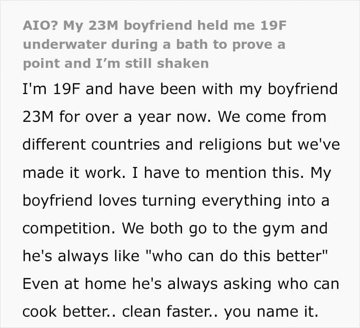 A woman asked the internet for advice after her competitive boyfriend “tried to prove a point” by holding her underwater. We reached out to the woman who shared the story via private message and will update the article when she gets back to us.