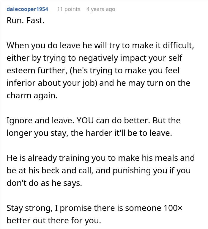 What a truly terrible place to end up in, like the author of this story, thinking you’re building a loving relationship with someone who’s meant to be your equal and your support, only to realize they’re mostly interested in having control over you.