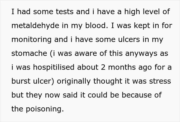 It’s clear that any kind of intentional contamination presents risks to human health. In the case of the protagonist of this story, food contamination with slugs can also be very dangerous, as slugs and snails contain rat lungworm, a parasitic worm that can cause brain infections. While most people who get an infection from rat lungworms don’t have any symptoms, in some cases, it can travel to the brain and cause meningitis, an infection in the brain’s lining that causes inflammation.