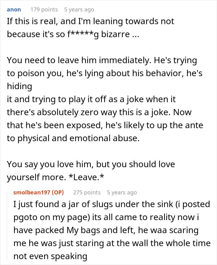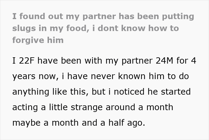What this woman didn’t expect was that it would deliberately happen in her own home, and the culprit would be her own partner. She was informed by her significant other’s friends that he was putting slugs in her food, and she decided to share everything that unfolded after that online, asking netizens for some guidance.