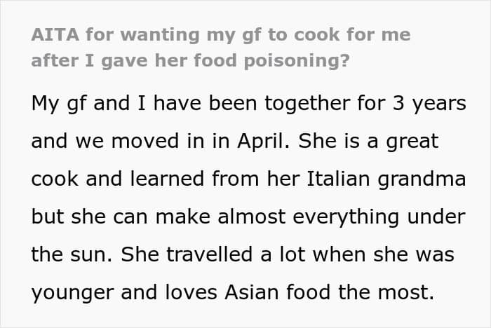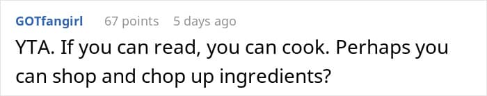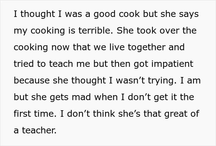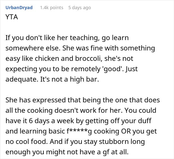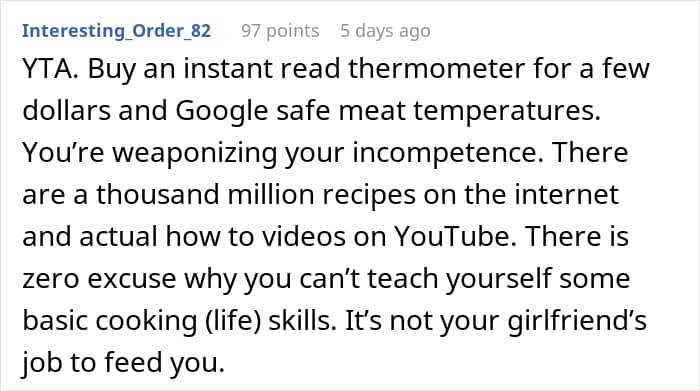 When you think about it, cooking once a week is not that big of an ask. If working with fresh food is a bit too much, the boyfriend can use premade options to make cooking easier. Having take-out or going out to eat can also be an option here.