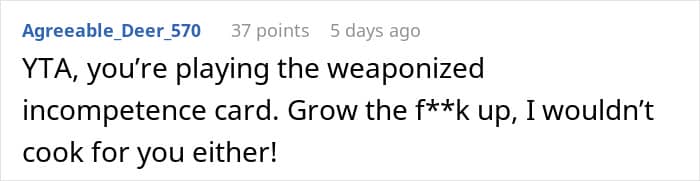 Purposefully screwing a task up so that you won’t get asked to do it again is a prime example of weaponizing incompetence. So is the phrase “You’re so much better at this than I am, why don’t you just take it on?” The author of this story seems to be using both of these to get out of his cooking responsibility.