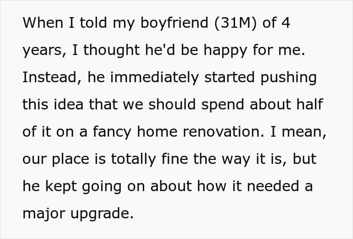 This redditor, too, encountered relationship problems over an inheritance. After she got the money, her boyfriend immediately started pushing his idea on how to spend it, while the OP had other plans for it. Not seeing eye to eye eventually became a relationship drama that ended in the woman wondering if she was overreacting.