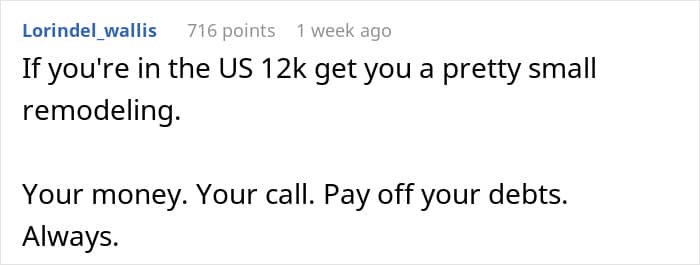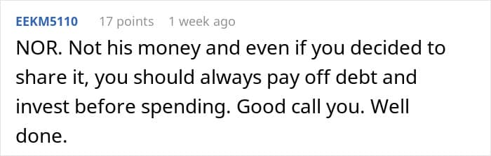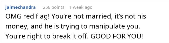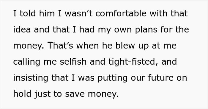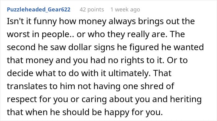 Unfortunately, in the OP’s case, talking about money didn’t lead to a happier relationship. The Redditor shared that what started as a calm conversation quickly turned into a shouting match. One of the main reasons for this was the different visions they had for how the OP’s inheritance money should be spent. Eventually, that led to the woman ending her relationship altogether, but that made her wonder if she was overreacting. Netizens in the comments assured her that she wasn’t.