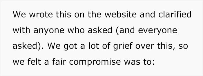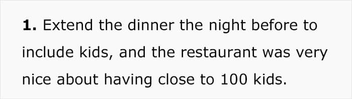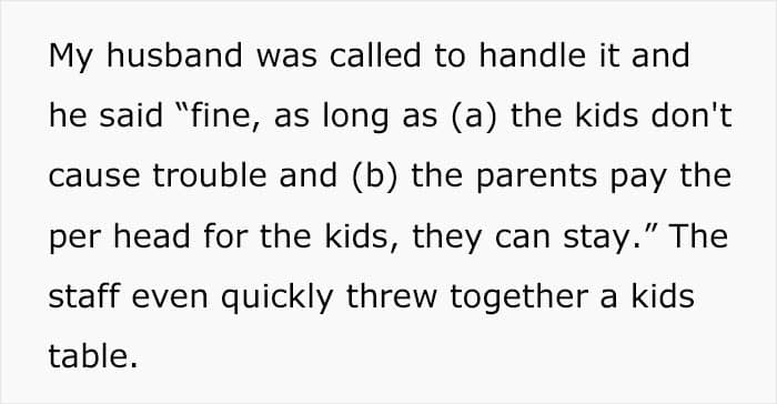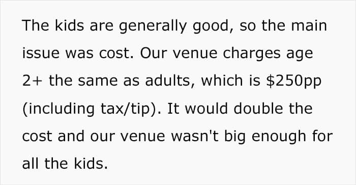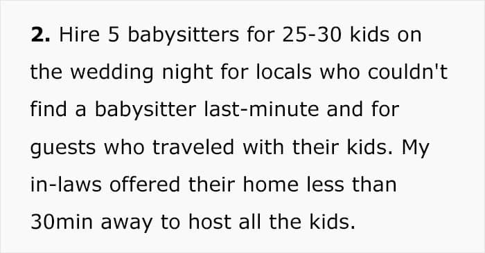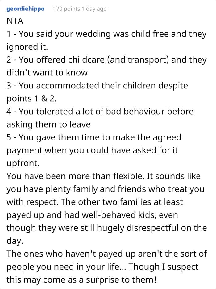 The AITA community was very sympathetic, however. They stressed that she had gone above and beyond to accommodate those guests who actually had children. She had extended the dinner before the wedding to include all the kids. She also hired 5 whole babysitters to take care of the munchkins while their parents went to the ceremony.