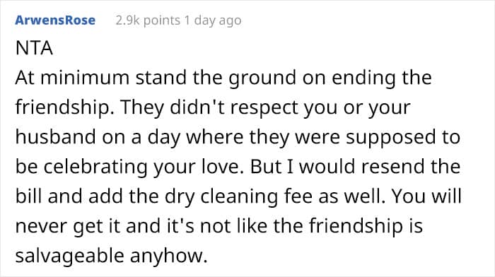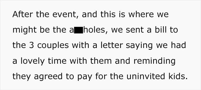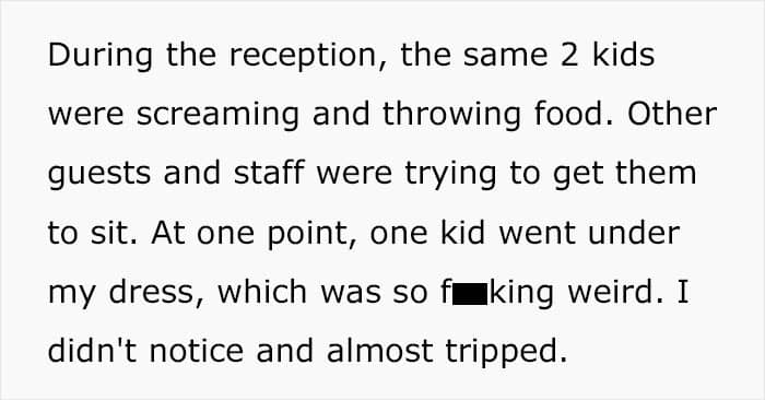 The bride, redditor u/AltruisticHapa, explained that two of the couples were very apologetic and paid for their kids who were additional guests. One couple, however, refused. They felt very entitled and thought that they did nothing wrong. Even though their kids caused the most damage. Including having ruined the bride’s dress.