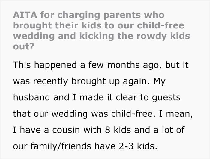 Well, one bride saw firsthand what happens when some people don’t follow the rules. She turned to the AITA subreddit for their verdict on whether or not she was a jerk for billing three couples because they brought their kids to her wedding when she explicitly asked everyone not to. She also went into detail about the chaos that unfolded, spearheaded by the rowdy munchkins. Scroll down for the full story.