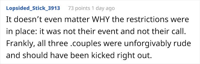 As the redditor put it, she and her husband concluded their friendship with that particular couple. And that was that. However, the bride was worried that she might have overreacted. Especially when she’d asked her husband to kick out the guests who had brought their children with them.