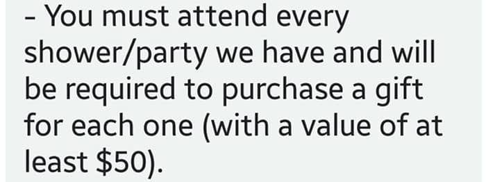 The bridezilla graciously opened up her bridal party to a ‘brawl,’ obviously anticipating a fight to the death for the ‘honor’ of being invited. Not only that but the rules for this brawl are astonishingly strict. She shared a list of demands to be met that even extends to a legally binding contract, guaranteeing that this greedy bride gets all the cash she wants out of everyone.