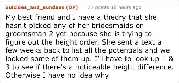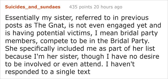 RELATED:This reddit user recently shared a ‘bridezilla’ story, about her sister who isn’t even engaged yet