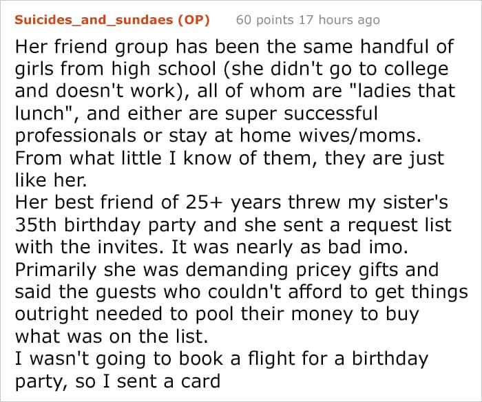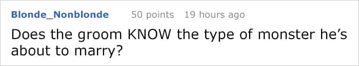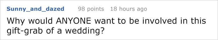 Following on from this bizarre list of expectations, and this bride who expected guests to foot the bill for her ‘blow out’ wedding, we have a new queen of the bridezillas. Shared in the JUSTNOFAMILY subreddit by user Suicides_and_sundaes, this tale of her sister’s delusional entitlement is jaw-dropping in its audacity.