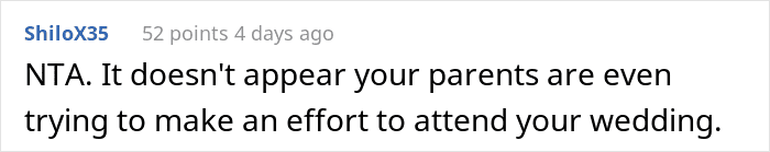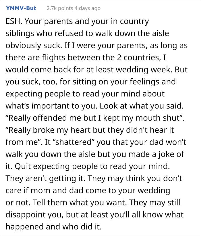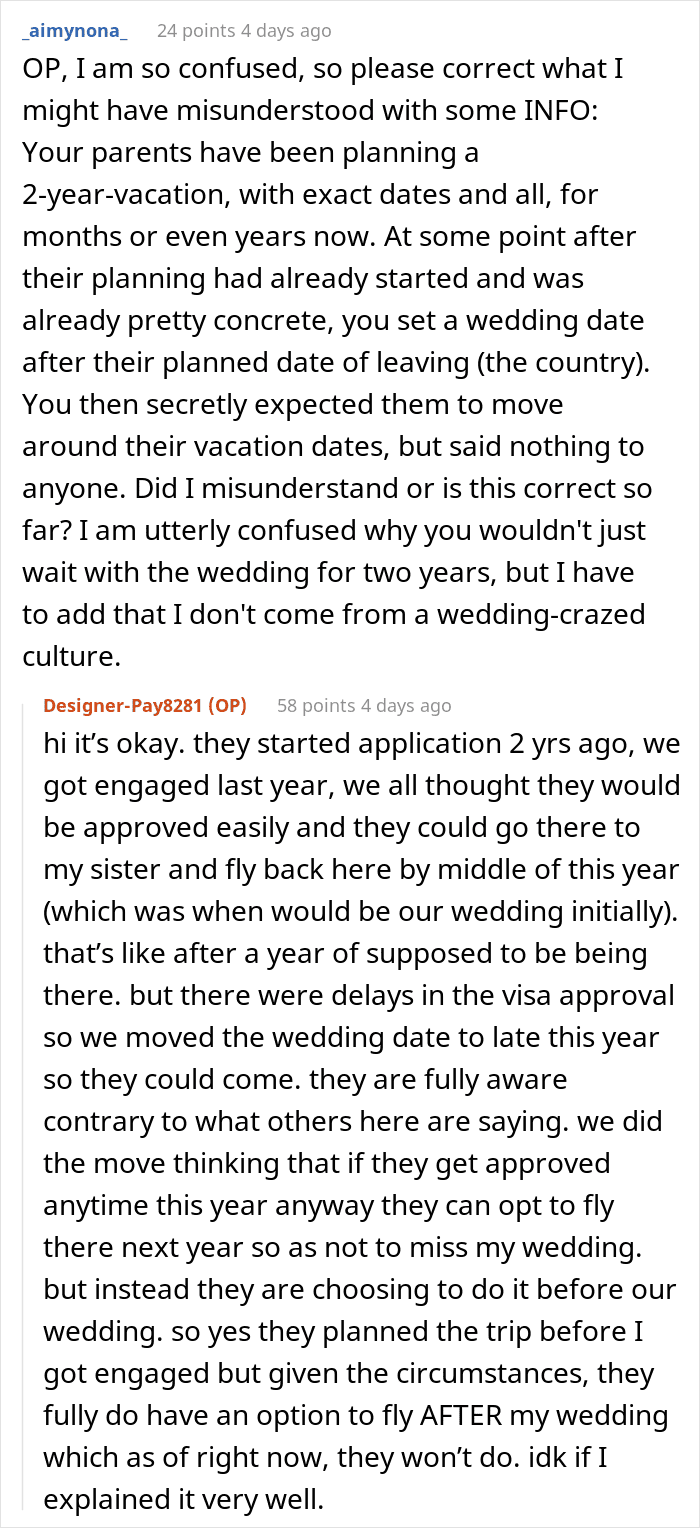 Quite a few members of the AITA community were a tad confused by the entire situation, including why the bride-to-be’s parents’ vacation was supposed to last for 2 years, and whether they knew the specific date of the wedding. Some also thought that the OP should have communicated her feelings more clearly so that her family knew where she stood better.