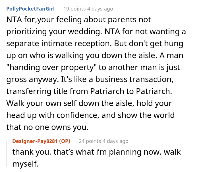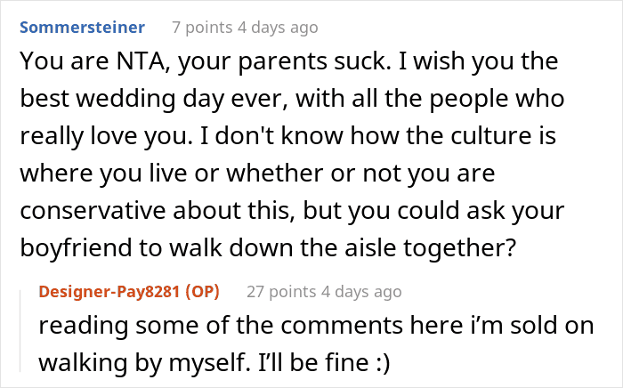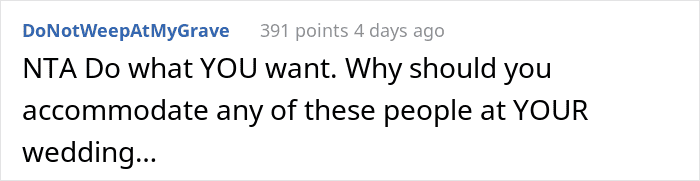 As a compromise, the idea of an intimate wedding reception just for the family was floated to see where the redditor bride-to-be might be interested. However, the OP was so upset about not having her parents at her wedding that she refused the idea time and time again.