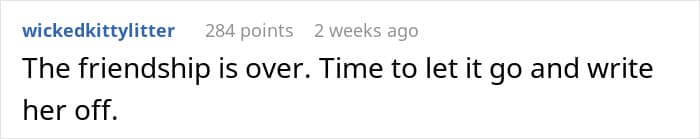 One woman shared how she was shunned by someone who once called her their best friend. The woman assumed she’d be a bridesmaid since the pair were quite tight. But instead of asking her to do the honors, the bride called her bestie to tell her she wasn’t invited to the wedding. As if that wasn’t enough, she texted her friend photos of the big day, rubbing a big handful of salt in the wound. The woman now feels it’s time to end the friendship.