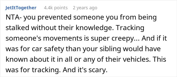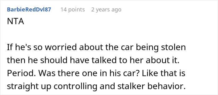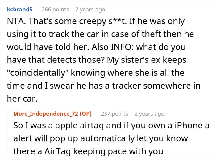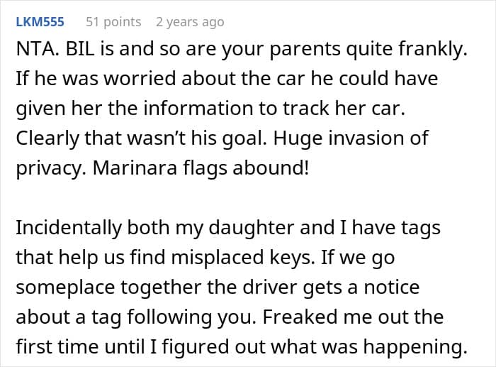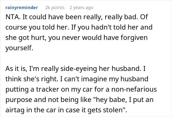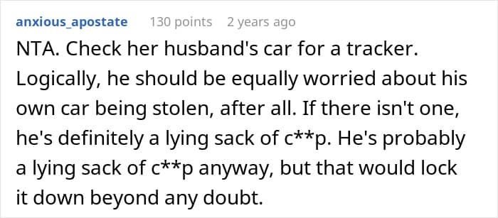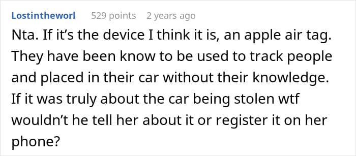 He says it for if their car ever gets stolen but she thinks he is assuming [she is] cheating. Now I’m getting heat from my parents about even finding the tracking device in the first place, so AITA?”