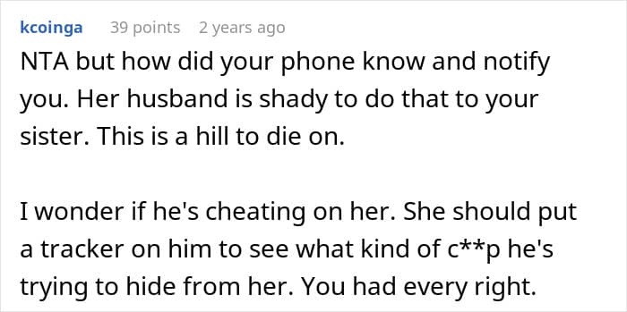 “I (23M) went to pick up food with my sister (30F) when I was alerted on my phone about a tracking device in her car. When we got back home we began to search for the tracking device and found it in a compartment in the trunk of her car. Immediately we thought about worse possible scenarios like if she was being followed but I decided to tell her to ask her husband (35M) if he had placed it there. She gave him a call and he in fact did place the device but since he never told her about it they began arguing about why he needed to be tracking her.