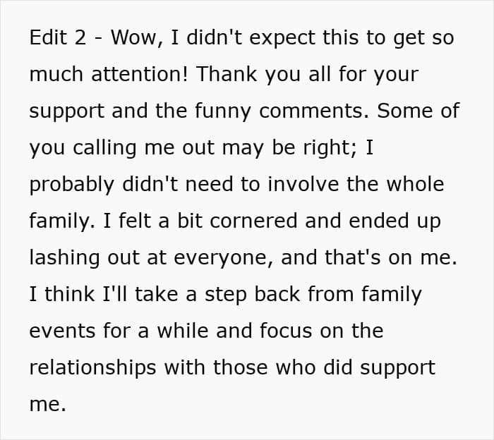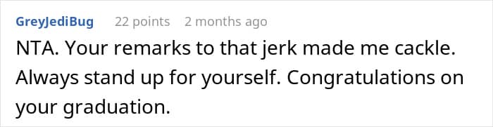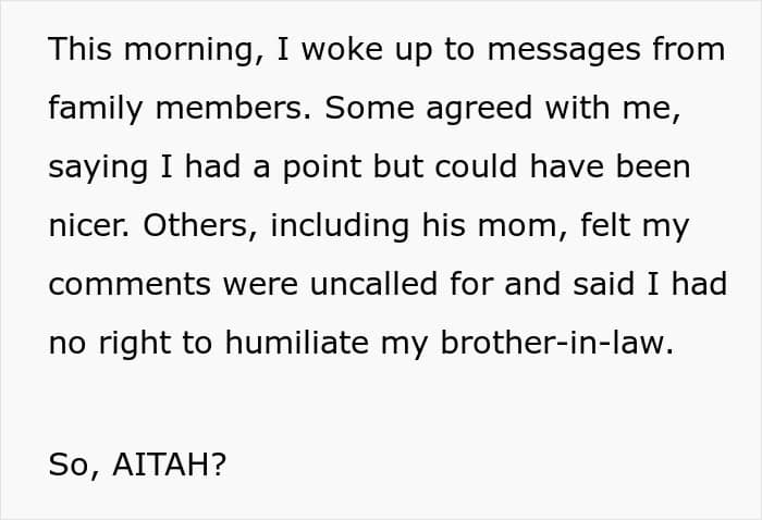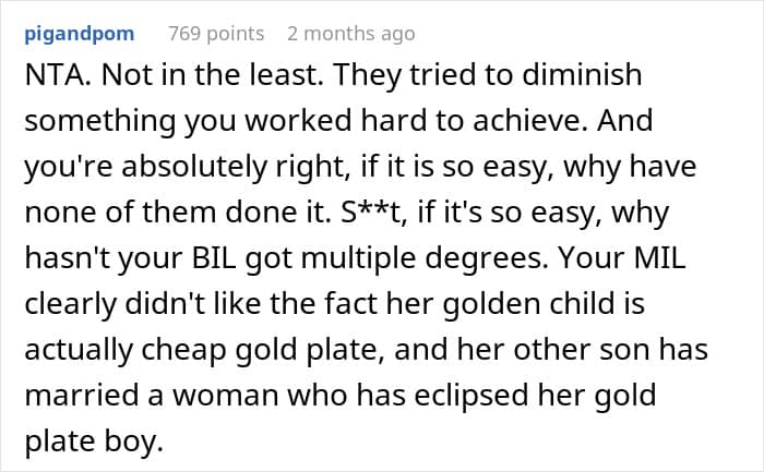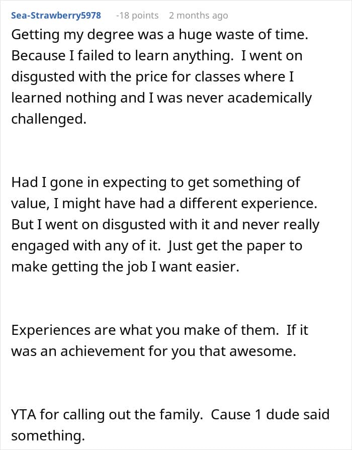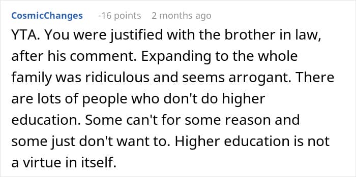 Some family members (and a few of the YTA comments, which can be found below) called her out, but it’s worth noting that she hardly “started” this argument. What she said can be construed as cruel, but she was just defending herself. After all, common social decency would be to smile and nod, even if you agree with the BIL. This is a family gathering, not a space to suddenly debate higher education.