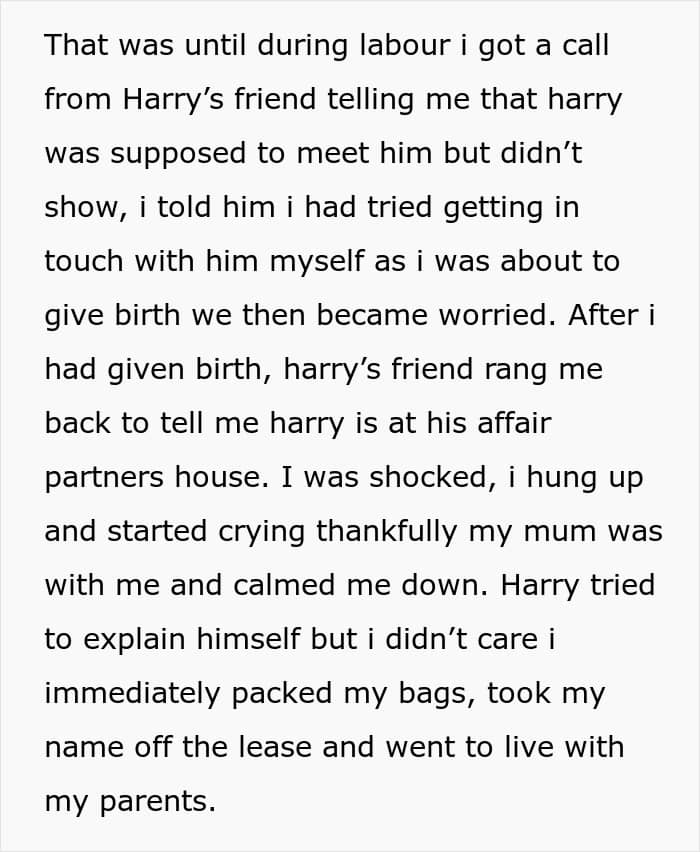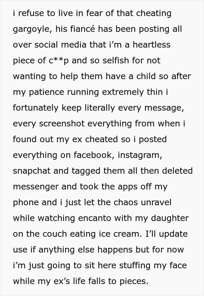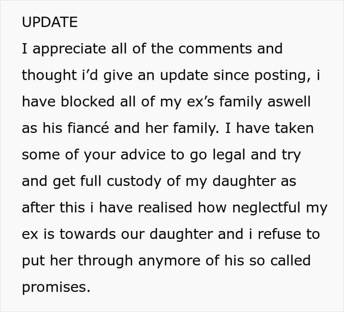 The woman made an update, continuing that after taking her time to process the events and reading through feedback from people online, she came to a decision to seek full custody of her child, due to her daughter’s father being neglectful towards her. She added that she also posted every relevant text from since she got cheated on and tagged the couple.