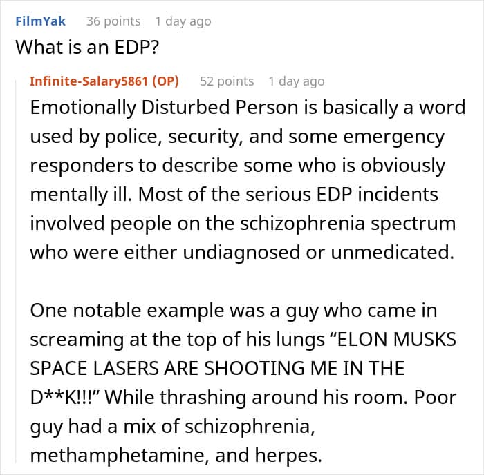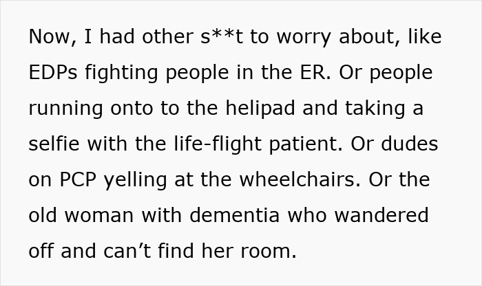 Though that version of excitement might not be what most people imagine. “Sometimes it involves restraining a combative patient. Or finding a missing psych or dementia patient who wandered off,” OP shared. “Sometimes you assist with lifting a bariatric patient. Sometimes you’re chasing off someone caught performing a lewd act in public (again).”