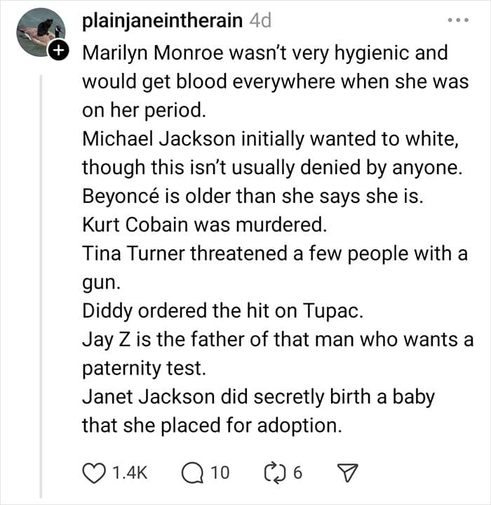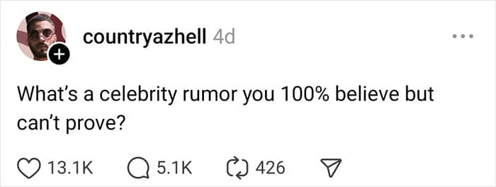 Entrepreneur, content creator, and social influencer Country (@countryazhell) recently went viral on Threads, Instagram’s app where you can share public conversations, after asking folks to share the celebrity rumors they “100% believe but can’t prove.” Scroll down to see their opinions and to get a general feel for how both fans and haters view some stars and public figures.