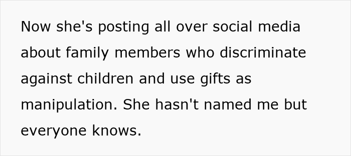 Moreover, she even started posting about it on social media, and the rest of the family also got involved. Some said that she should just give them something small for the sake of it, so the poster was feeling conflicted about her action. Her sister even threatened not to attend if OP didn’t apologize and get something for her kids, but our lady just couldn’t take it anymore.
