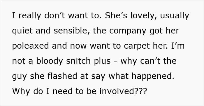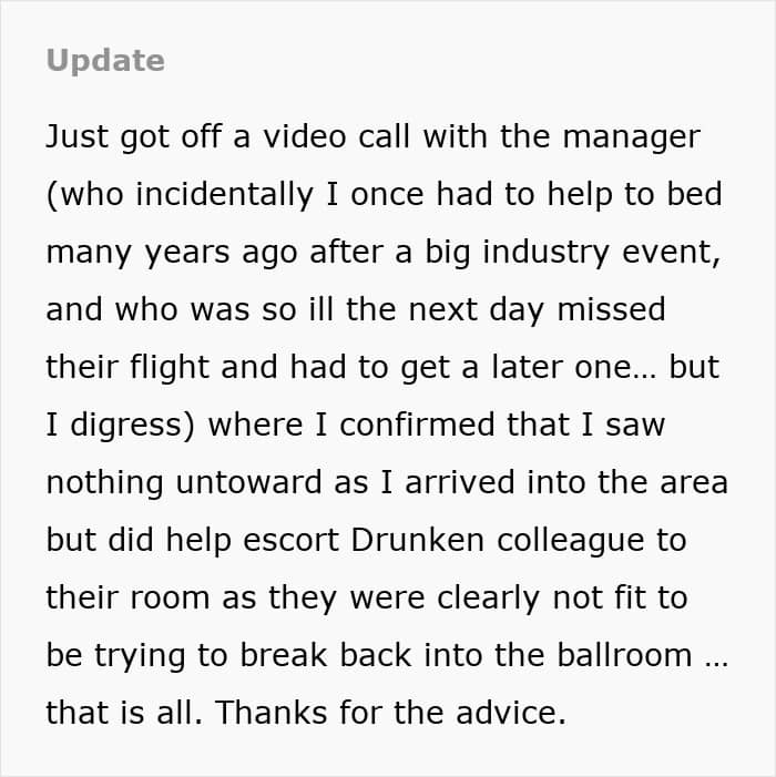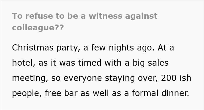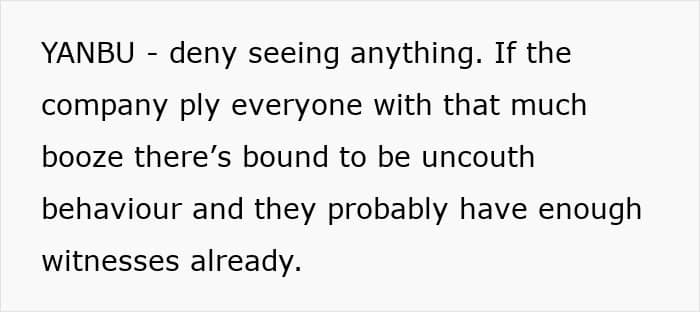 The narrator is now caught in a classic ethical dilemma. They are being pressured to provide the testimony that could get a “lovely” colleague fired for a drunken mistake at a party designed to encourage exactly that kind of behavior. They’re now asking the internet if they’d be the jerk for simply denying they saw anything and staying out of it.