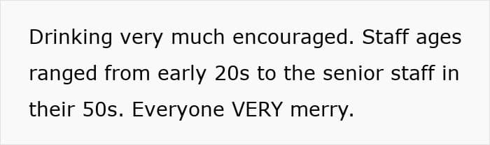 The narrator’s feeling that the company is hypocritical is backed up by a common, predictable reality. According to a survey fromSlater and Gordon, a staggering one in four employees admit to regretting their behavior at a company Christmas party, often fueled by the free-flowing alcohol provided by the employer.
