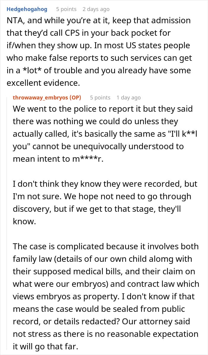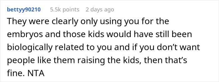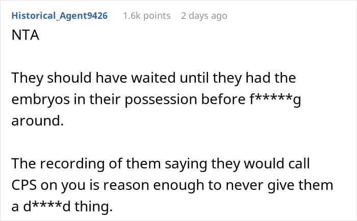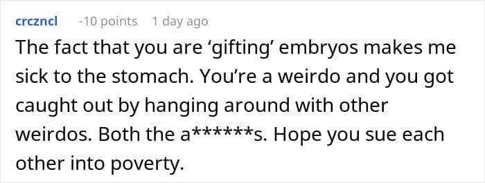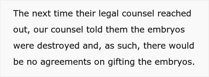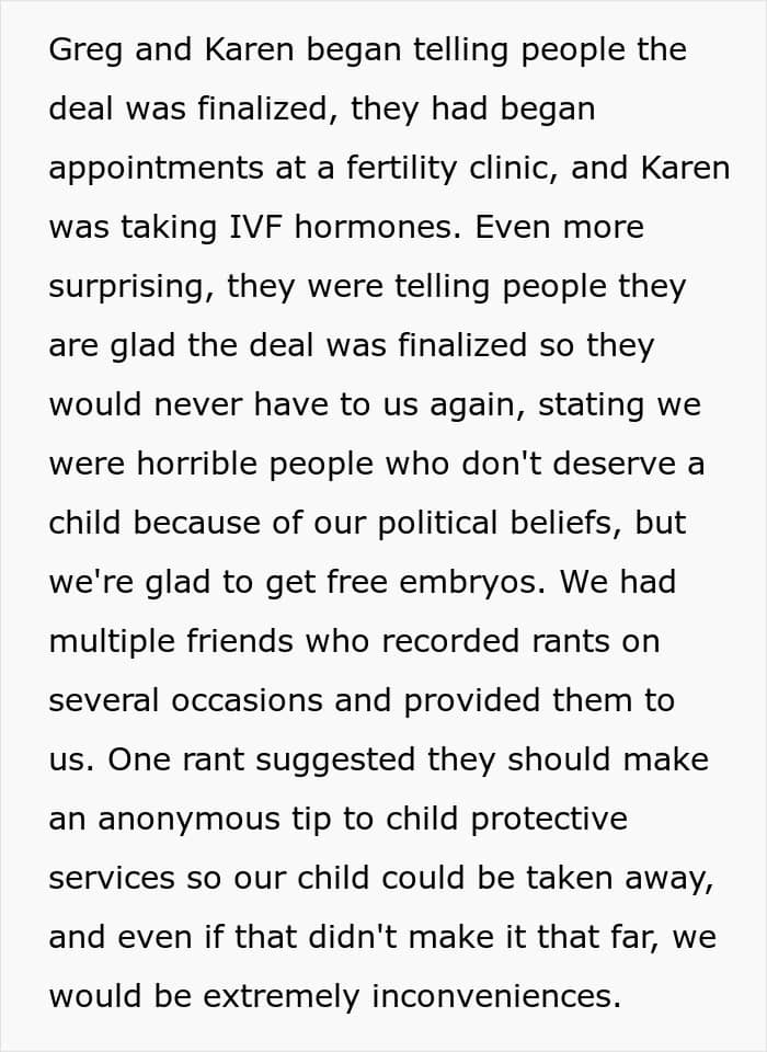 Then the truth came out. Behind their backs, those “friends” were insulting them, badmouthing them, and even saying they didn’t deserve their own child. Heartbroken by what they learned, the couple decided to have the embryos destroyed instead of handing them over.