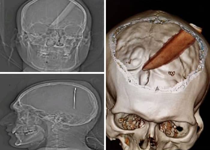 Had a guy come in with a knife sticking out the back of his head. The person who stabbed him did it at such a perfect angle that the blade slid into the space between the two hemispheres of the guy’s brain. No damage, discharged a couple hours later. .