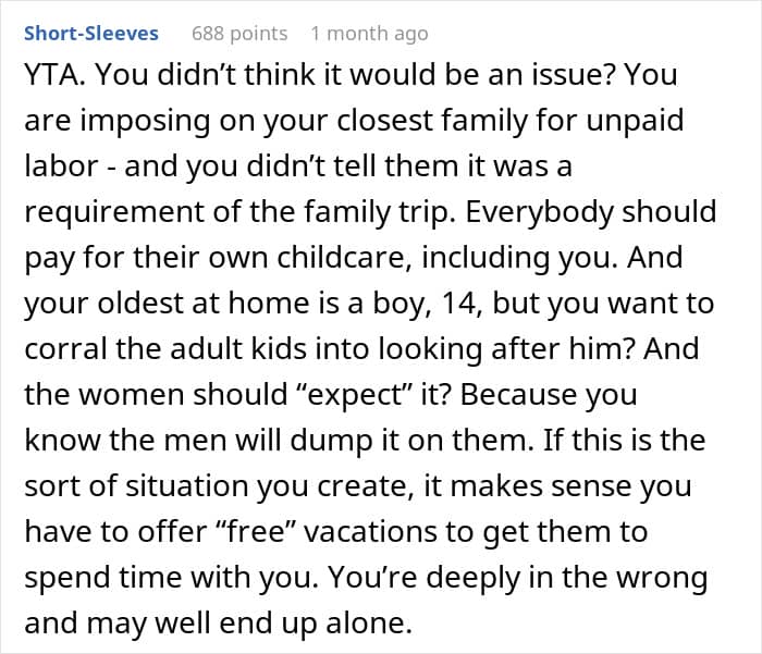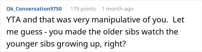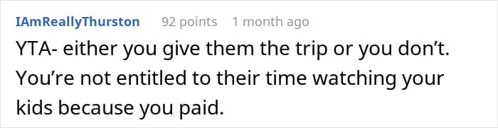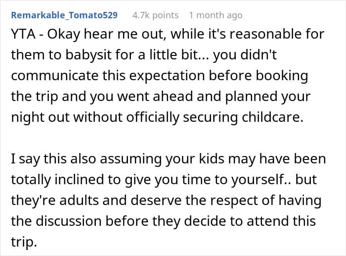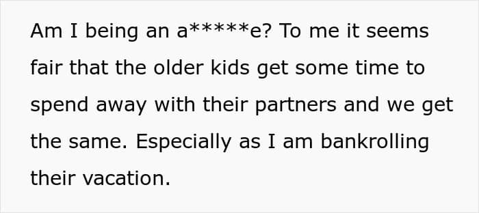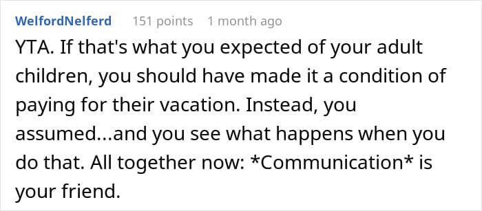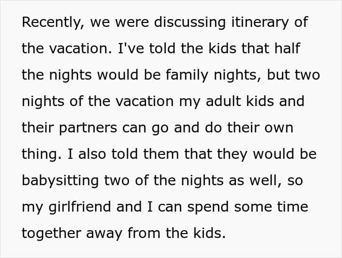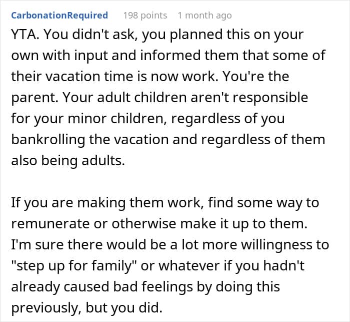 But not all siblings are equally eager to spend their time making sure that their beloved annoying brother or sister is safe and sound; especially while on vacation. This redditor’s adult children seemingly weren’t. When the parent bought a family vacation, they expected that the older siblings would look after the little ones at least a couple of nights during the getaway, but the kids weren’t too happy with such an arrangement.