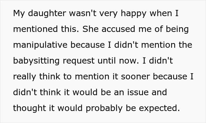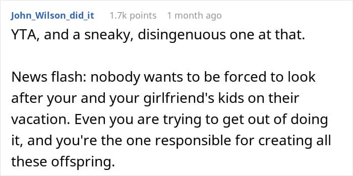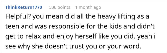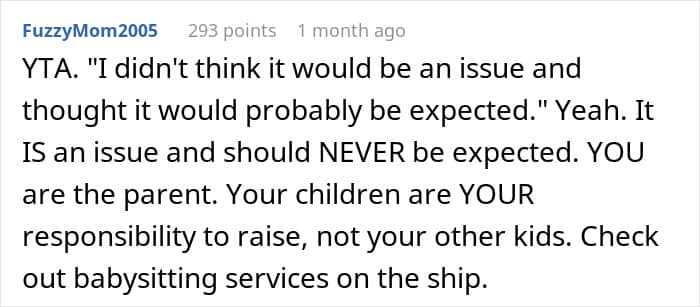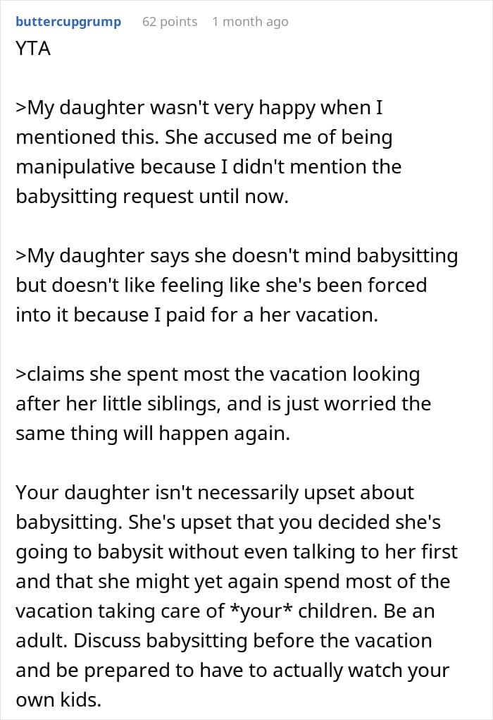 It’s unclear how good of a relationship the redditor’s kids have; however, their daughter said that she doesn’t mind babysitting her younger siblings. In her case, the problem was not spending time with the little ones but the fact that her parent didn’t ask for help or discuss the arrangement with the older children first before making plans for the vacation. Quite a few redditors sided with the daughter, saying that the OP didn’t handle the situation quite well.