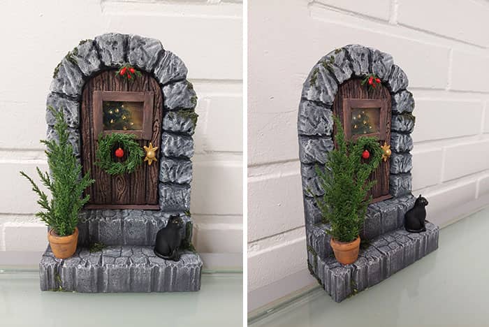 The door is approximately 20-25 centimeters tall. The stone parts were sculpted from Finnfoam and the door was from foam rubber, window frames are ice cream sticks. There is a piece of hardboard on the backside for support. The cat, doorknob and plant pot are silk clay and Fimo clay. The little pine tree and Christmas wreath I made of artificial flower parts. Painted the view in the window with acrylics.