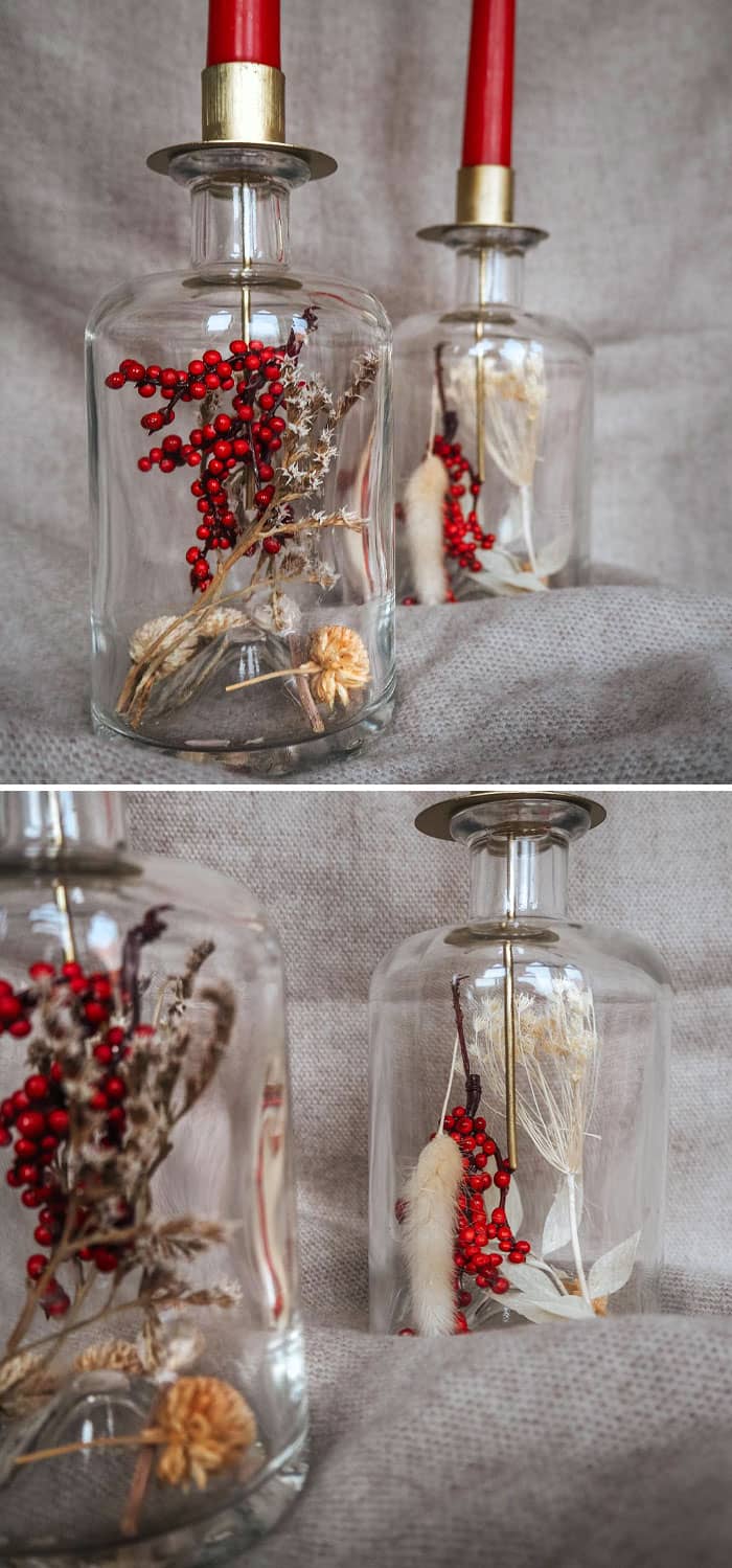 All you need are old bottles, a few dried flowers, and a colored candle. A quick Christmas decoration is ready, which you can adapt to the seasons.