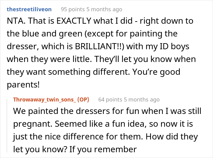 Like you probably expected, dear Pandas, the vast majority of redditors came out in full support of the mom who posted on Reddit. They stressed that it was nothing new for the parents of twins to color-code each kid. What’s more, they noted that, at that age, it’s important parents to, well, parent. It’s hard to talk about true, fully-fledged individuality and making rational decisions for oneself when you’re a year and a half old. (That happens slightly later.)