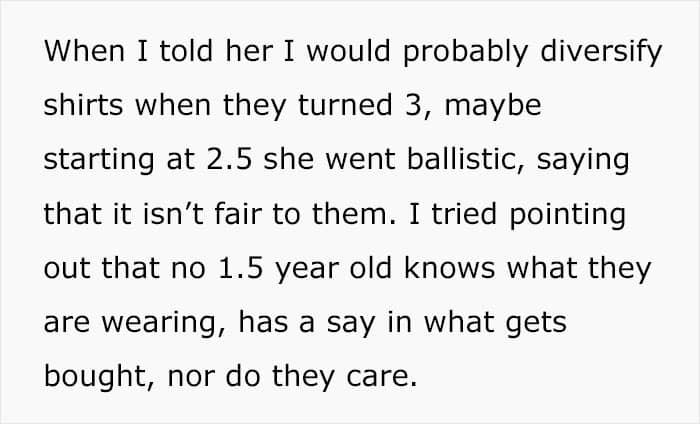 Well, some people don’t think so. In fact, they believe that parents choosing their kids’ clothes might be tantamount to ‘stifling their individuality.’ One redditor, a mom to identical twins, turned to the AITA subreddit to check whether or not she was in the wrong for dressing one of her twins blue and the other green. You see, a cousin of her husband’s had accused her of ‘forcing them’ to dress how she wants. In fact, she went ‘ballistic’ and thought it was unfair to them.