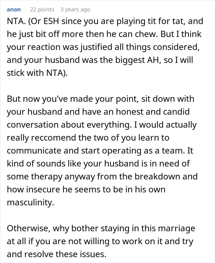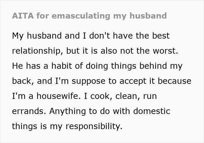 One woman reached out to Reddit for advice after her husband claimed that she had emasculated him during an argument in front of his parents. Below, you’ll find all of the details that the author shared online, as well as some of the replies invested readers left her.