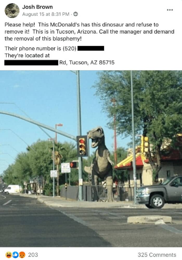 #55 Christian’s Against Dinosaurs Demand To See The Manager Over A Dinosaur Statue That’s Been Up Since 1994 Apparently