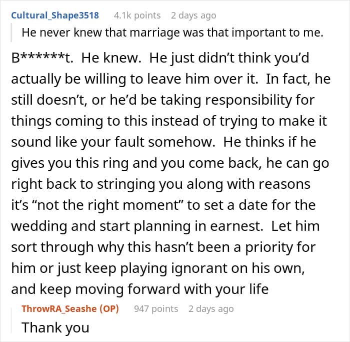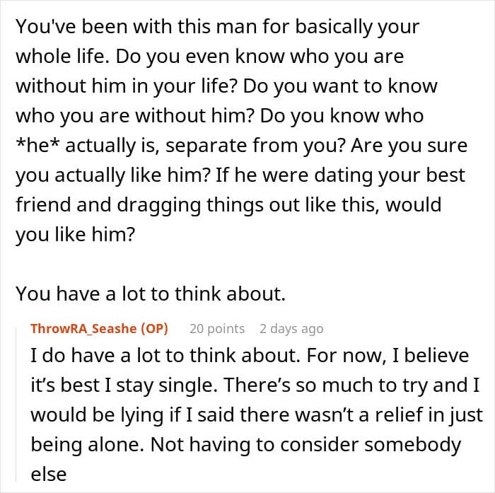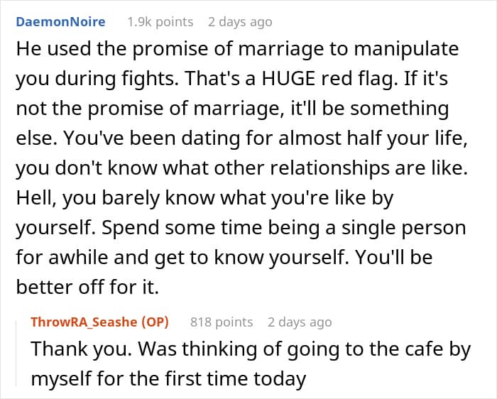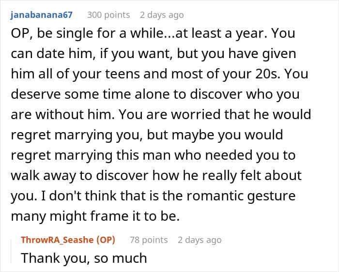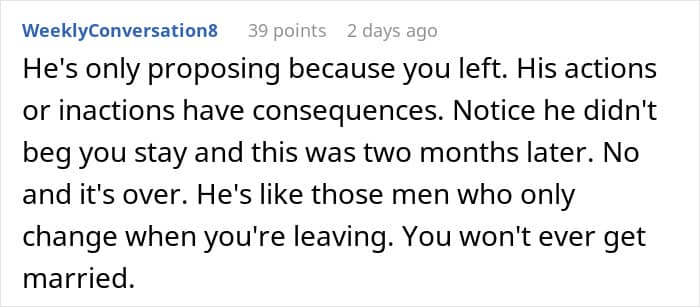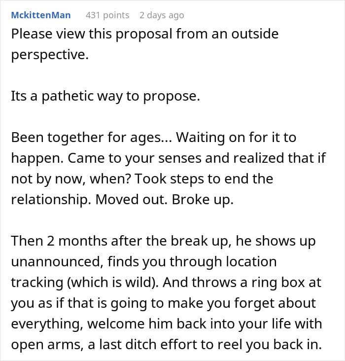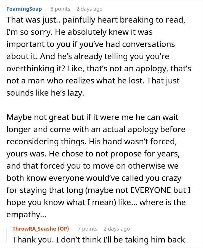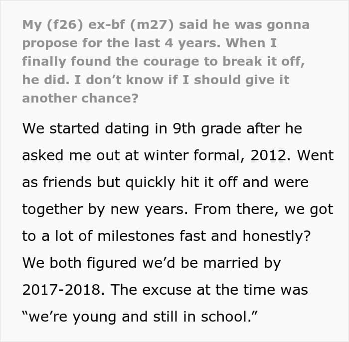 Unfortunately, that wasn’t the case for this couple. Their timelines were completely out of sync, with the girlfriend already waiting for a proposal for a few years, while the boyfriend wasn’t feeling in any rush. Tired of waiting, she decided to break things off, which, as a result, has awakened something in her partner.