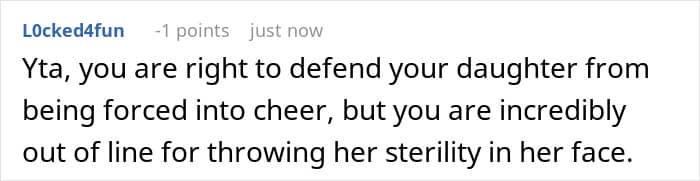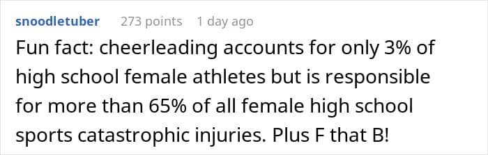That was one of the reasons the girl’s mother didn’t appreciate her ex’s “affair partner” pushing her daughter. She was also seemingly worried about the likelihood of cheerleading-related injury. Some research points out that high school cheerleaders experience an average of 3.8 injuries throughout their careers. The mom shared her concerns in the comments, where fellow netizens shared their varying opinions on the situation, too.